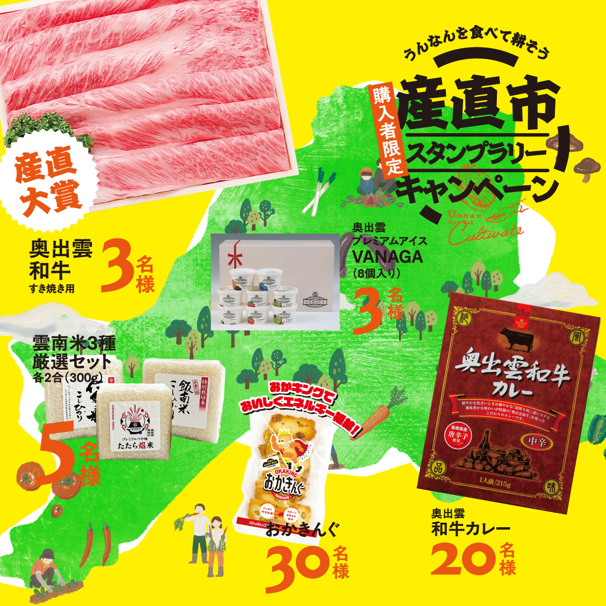 島根県雲南市・奥出雲町・飯南町・松江市・広島県三次市にある産直市(大東モリモリ奥出雲、Aコープかも産直コーナー、遊学ファーム、たんびにきて家、木次とれたて市場、道の駅おろちの里、みとや青空ふれあい市場、グリーン掛合、よってごし菜、よこただんだん市場、Aコープよこた産直コーナー、特産の駅おくいち、仁多特産市、酒蔵特産市、青空市ぶなの里、Aコープエルシィー産直コーナー、ぼたんの郷、松江モリモリ奥出雲、iマルシェ)で買い物をされた場合、応募はがきの裏面にスタンプを1つ押印します